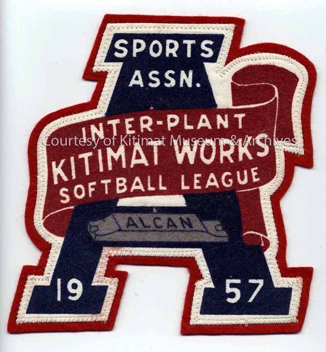 - Shaped patch, in a letter A, red and blue felt with white embroidery. Top of patch reads 'Sports Assn.' The middle of the patch reads 'Inter-plant Kitimat Works Softball league' in a banner effect with a small ingot with 'Alcan' beneath, and the numbers '19' and '57' at the bottom.