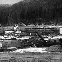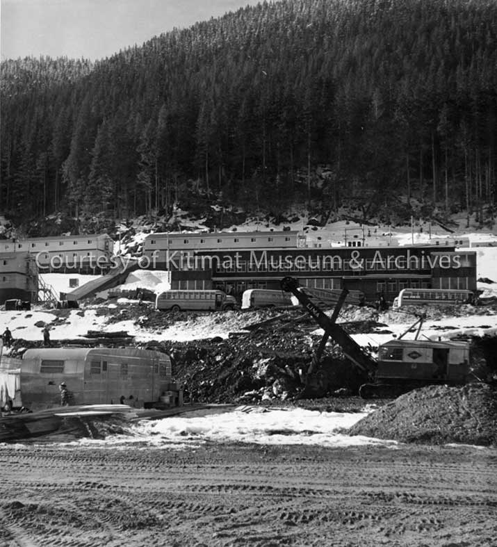 - Bunkhouses (background), Hudson’s Bay Trading Company (centre) and buses waiting to transport workers to the job sites.