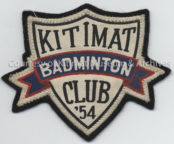- Patch with black back and silver front with black text and red and blue banner. Inscribed with Kitimat Badminton Club '54