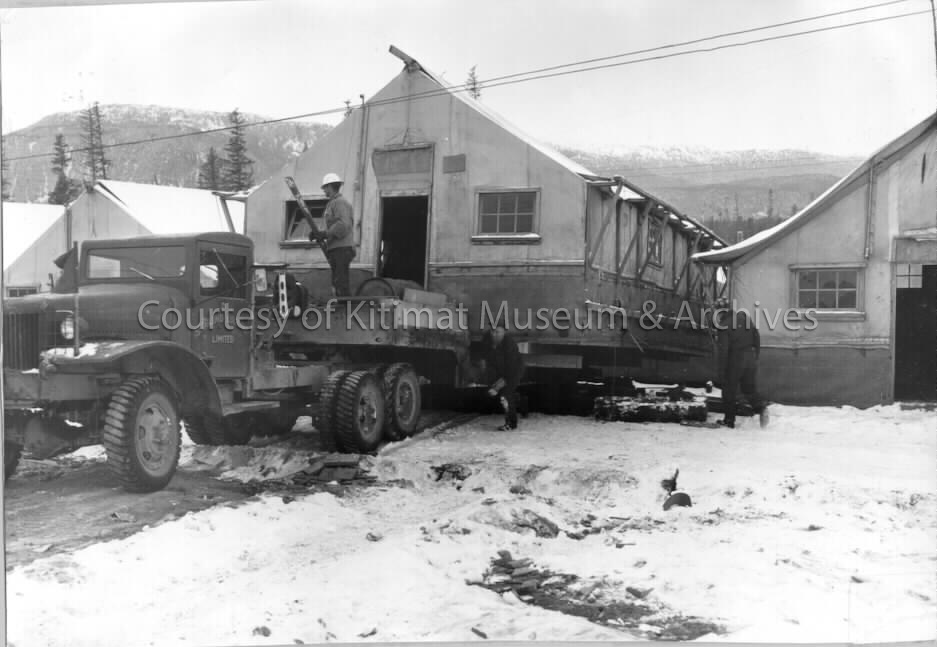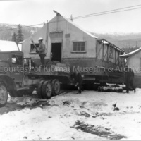 - Photo taken at Upper Townsite Camp showing tent being loaded for movement to Lower Townsite Camp