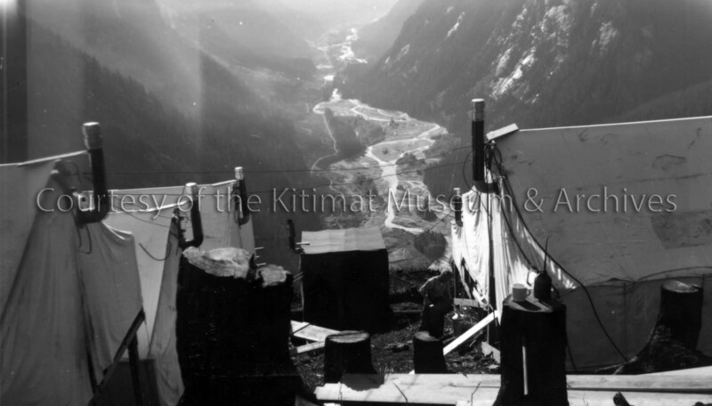 - Photo depicts the tent camp at tower No. 106 in the Kemano Pass. Kemano River Valley is in the background.